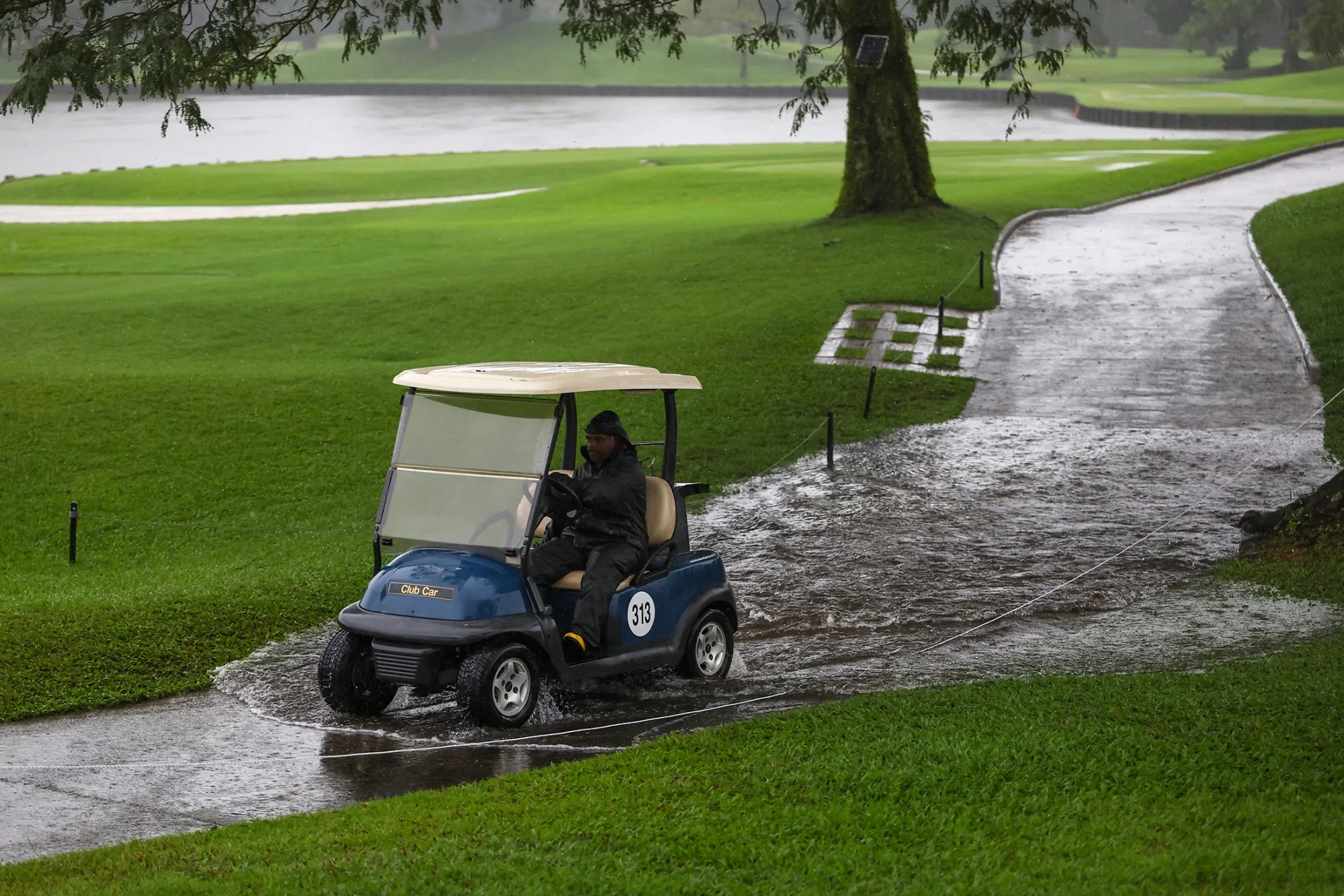 在保時捷新加坡精英賽的第一天,拉古納國家高爾夫度假村俱樂部的一名員工駕車穿過積水,比賽因雨暫停。攝影師:Yong Teck Lim/Getty Images但面對自然力量,財富和智慧也只能做到這麼多。一個日益增長的威脅是一組來自新加坡、香港和中國的科學家所稱的突發性洪水——由5分鐘內超過5毫米(0.2英寸)的短時強降雨引發的城市內澇。