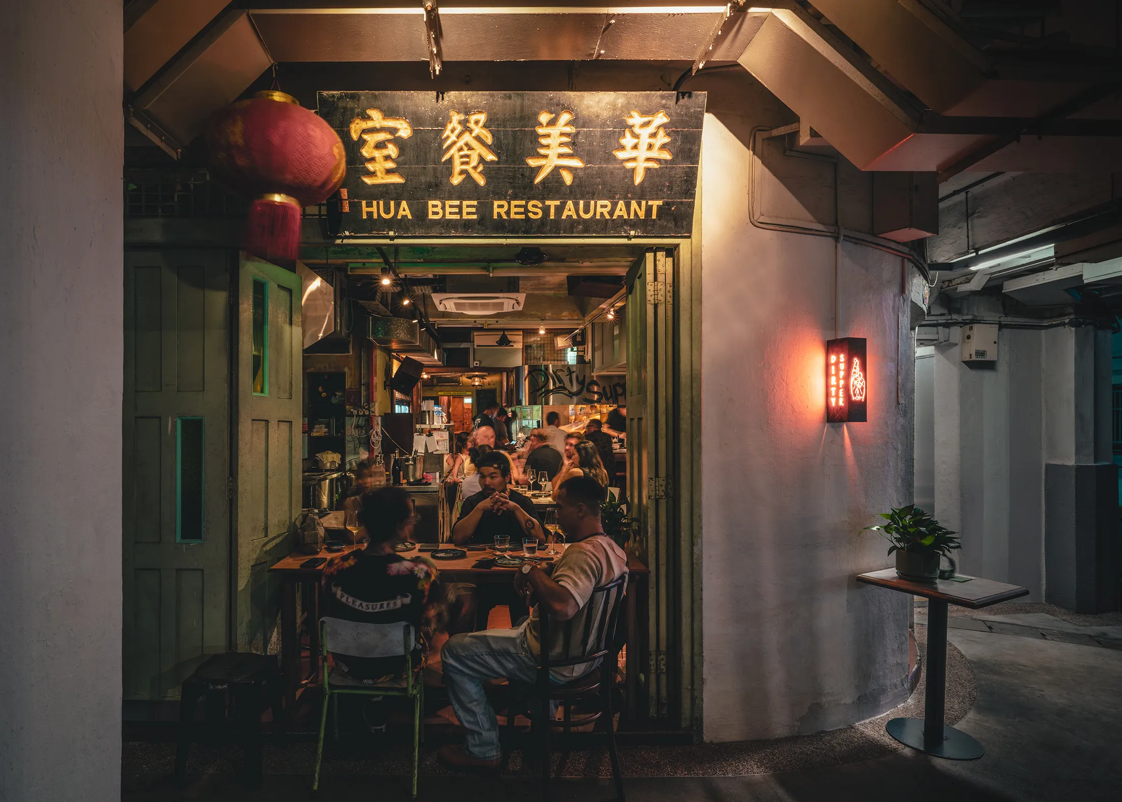 Dirty Supper的夜間變身。來源:Dirty Supper氛圍。 性感、暗黑、粗獷。Dirty Supper像是一個值得盛裝出席的地下秘密據點。它迷人、前衞,與烏節路的浮華氛圍截然不同。大理石與木質台桌搭配淡藍色陶瓷牆磚,營造出復古情調,塗鴉環繞的出餐口上方掛着每日特供的黑板菜單。