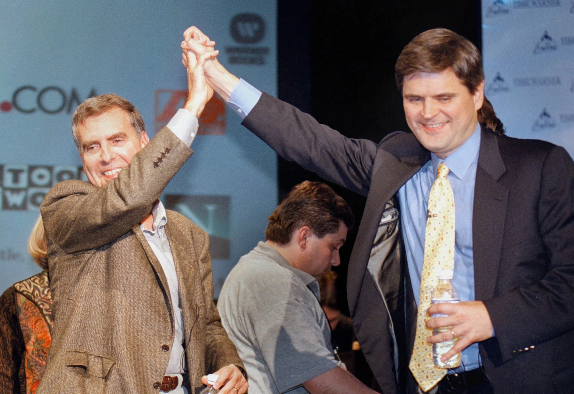 2000年,傑拉德·萊文與史蒂夫·凱斯宣佈美國在線收購時代華納時的合影。攝影師:克里斯·洪德羅斯/赫爾頓檔案館/蓋蒂圖片社"當時互聯網概念被過度炒作,早在盈利模式成型前就形成泡沫,“諾貝爾獎得主、MIT經濟學家達龍·阿西莫格魯指出,“這正是互聯網繁榮與崩盤的根源。”