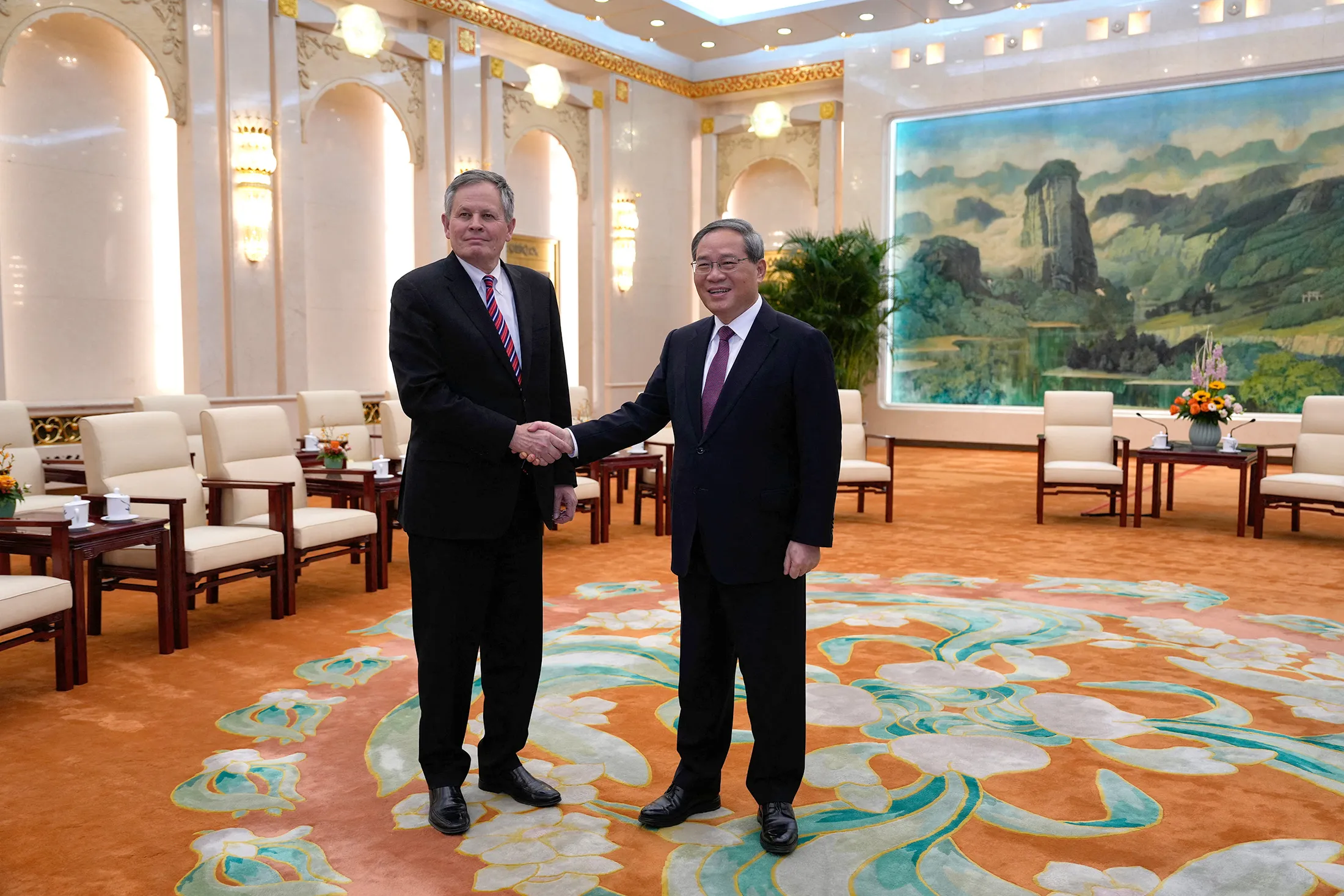 戴恩斯與中國國務院總理李強昨日在北京人民大會堂會晤前握手。攝影師:Ng Han Guan/Pool/AFP/Getty Images在特朗普宣佈4月2日關税前,談判仍陷僵局的另一跡象是,習近平未在戴恩斯為期三天的訪問期間接見他——儘管已有先例。2023年中國領導人準備與當時的美國總統拜登會晤時,曾分別會見過一位美國參議員和加州州長。