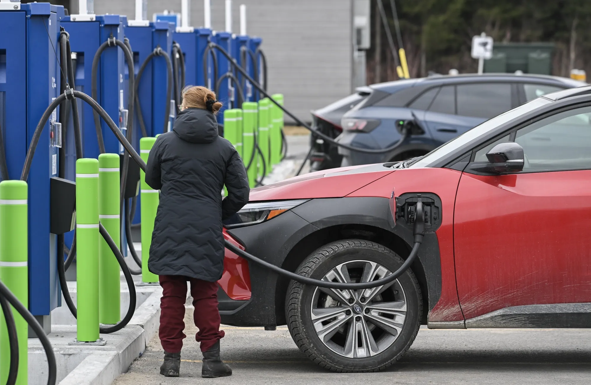 加拿大魁北克省聖路易德布蘭福德楓樹門休息區,一名司機正在快速充電點為電動車充電。