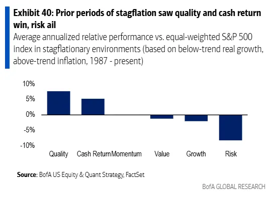美銀建議採用因子投資策略——即基於股票價格或波動性等特定特徵的投資方法。該行對1957年以來數據的分析顯示,在歷次滯脹時期,優質股是跑贏大盤的類別之一,而價值股、成長股和高風險股票則表現疲軟。