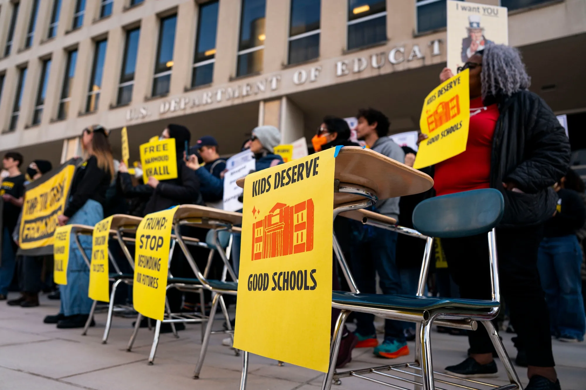 2025年3月13日,華盛頓美國教育部總部外的抗議人羣。攝影師:Al Drago/Bloomberg“削減教育部預算將通過導致班級規模激增、削減職業培訓項目、使高等教育更加遙不可及、剝奪殘疾學生的特殊教育服務以及削弱學生民權保護等方式傷害所有學生,”全國教育協會主席貝基·普林格爾在聲明中表示,“這將進一步擴大教育差距。”
