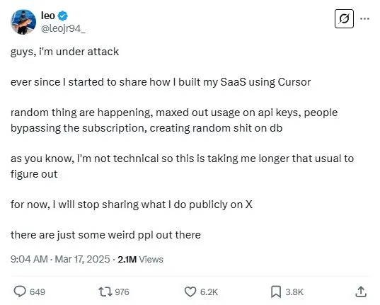 來源:https://x.com/leojr94_部分問題在於他本人並非資深程序員,無法正確審核工具生成的代碼。但過度依賴氛圍編程的企業還可能面臨安全威脅。研究發現,像GitHub Copilot和Cursor這類AI編程工具可能被隱藏指令誘導生成不安全代碼。被篡改的文件能暗中指示AI在開發者代碼中植入安全漏洞或後門而不被發現。