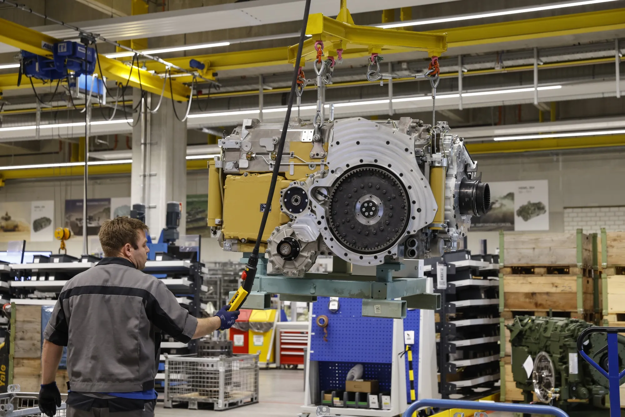 工人在奧格斯堡檢修豹2坦克變速箱部件。