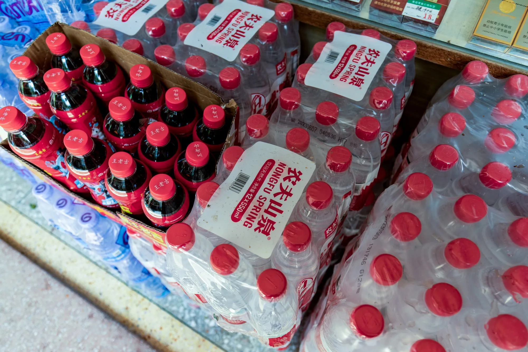 中國廣東省河源市便利店內成排的農夫山泉瓶裝水。圖片來源:彭博社