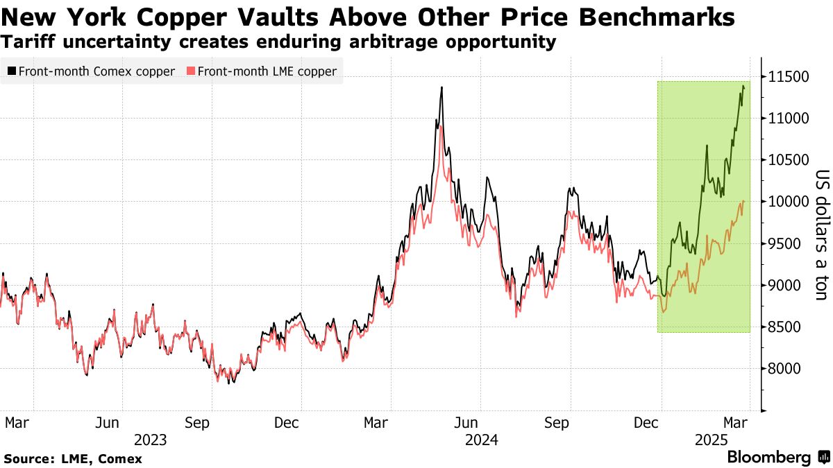 美國銅期貨1月開始超越LME價格加速上漲,在上屆總統特朗普上月以國家安全為由下令商務部對銅關税展開調查後,價差擴大至創紀錄水平。本週一COMEX近月合約與LME銅價差達到每噸1400美元以上的峯值。