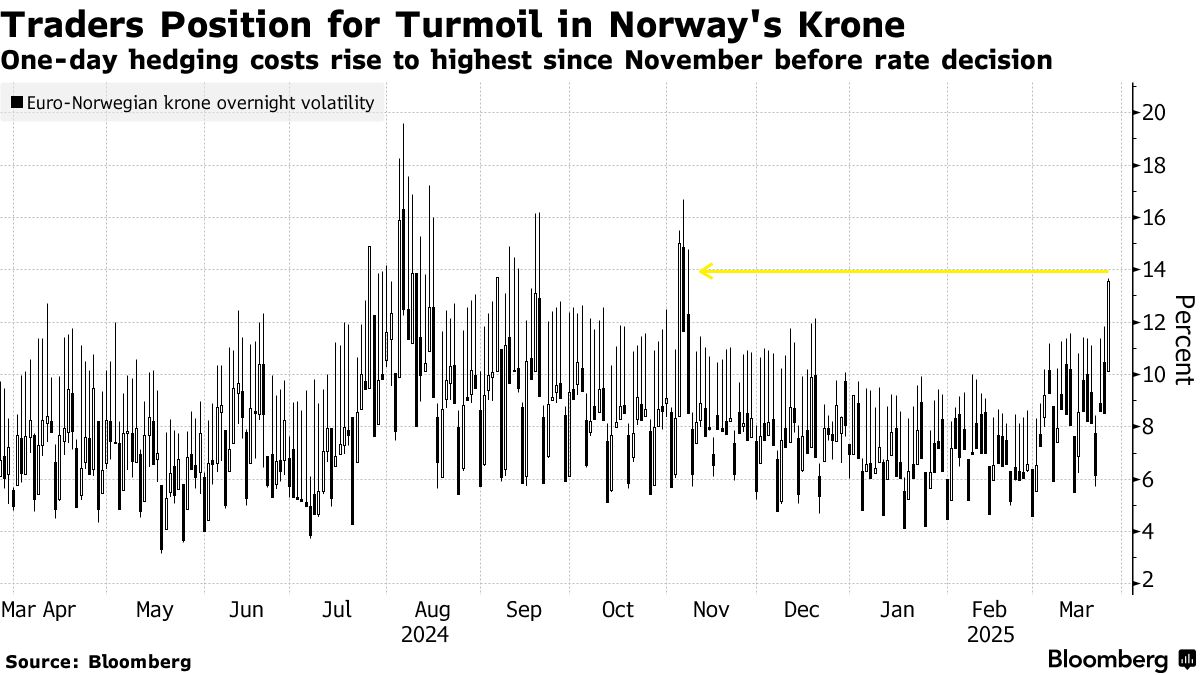 歐元兑克朗的隔夜波動率升至13.65%,超過12月和1月貨幣政策決策前的高點。此前挪威央行行長伊達·沃爾登·巴切年初曾暗示明日政策會議"很可能"降息25個基點,交易員當時已完全定價這一寬鬆舉措。