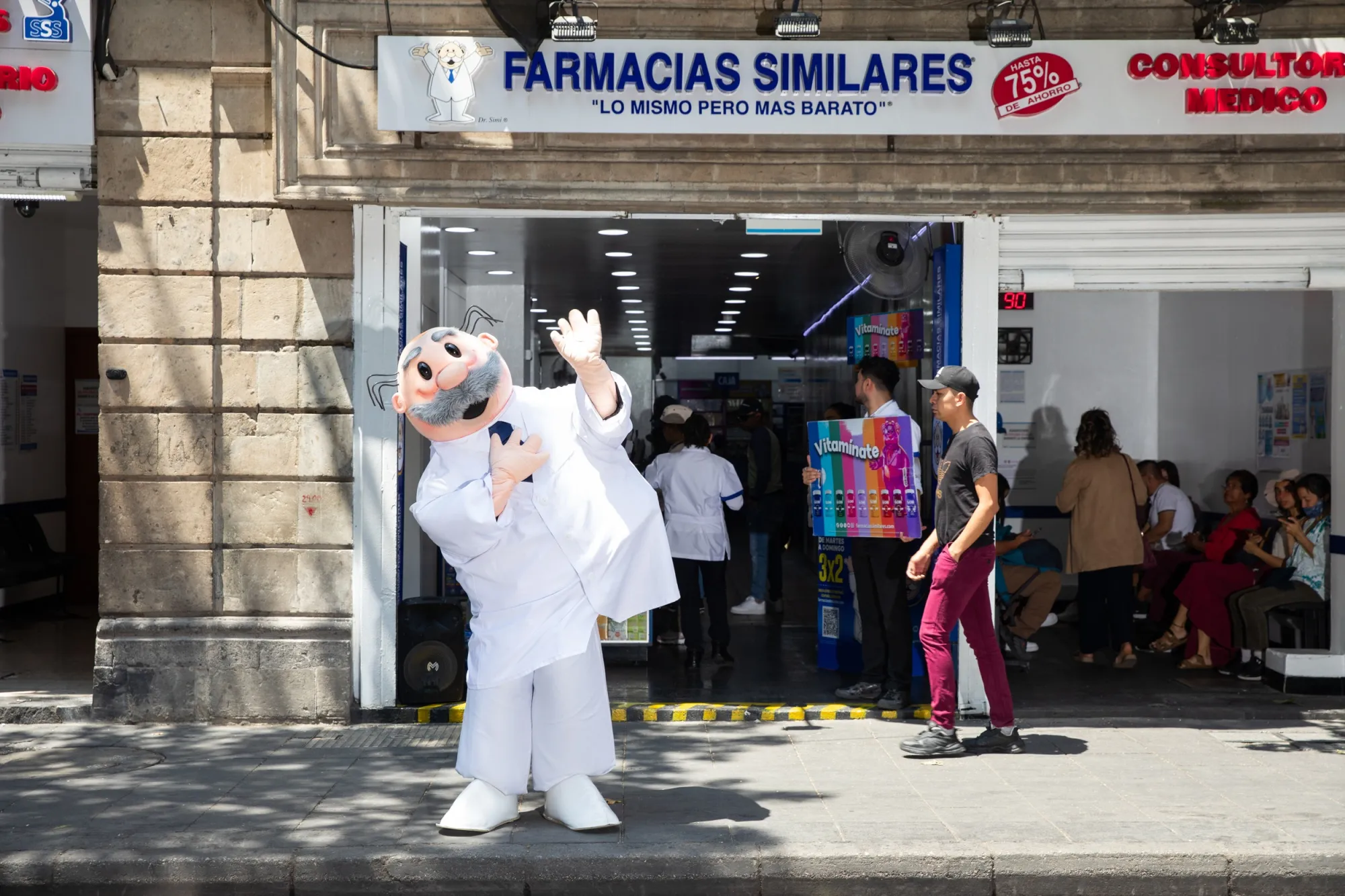 墨西哥城一家藥店外的Dr. Simi人偶。圖片來源:Angie Smith/彭博社在墨西哥這個公共衞生系統常常效率低下且物資匱乏的國家,Similares連鎖藥店為許多低收入羣體填補了空缺。這家家族企業於1997年嶄露頭角,同年墨西哥頒佈法律要求藥品必須標註活性成分而非品牌名,旨在提升民眾對平價藥品的可及性。Similares藥店將數千家低價藥店與附屬診所相結合,僅需60比索(3美元)即可快速問診。這使得其服務與歡樂吉祥物成為貧困社區的標配。該品牌在墨西哥無處不在,還在智利和哥倫比亞開設了約500家分店。