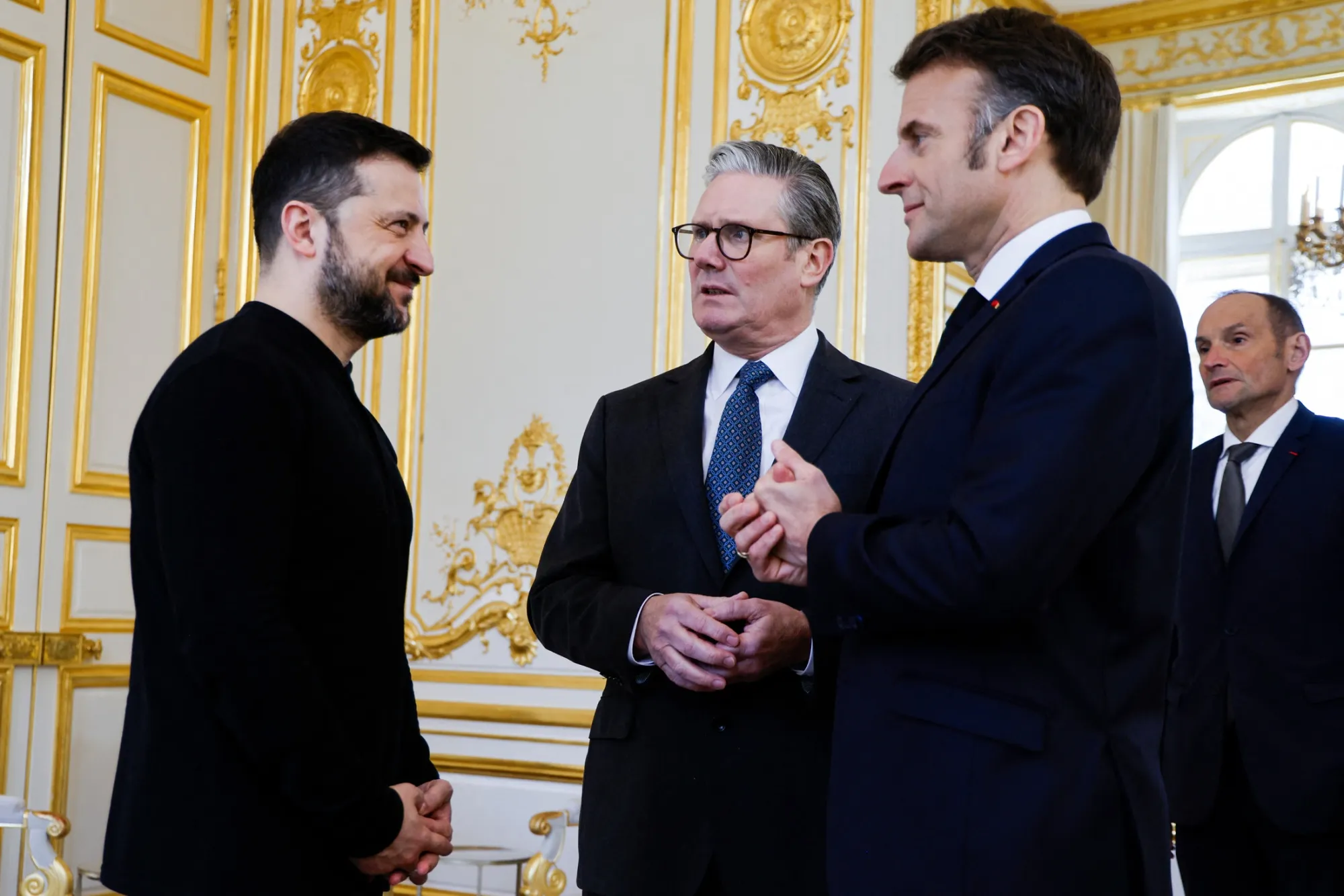 3月27日巴黎,從左至右:弗拉基米爾·澤連斯基、基爾·斯塔默與埃馬紐埃爾·馬克龍。攝影師:盧多維克·馬林/法新社/蓋蒂圖片社"我們期待新的強力決策,現在是推進關於安全保障及盟國駐軍烏克蘭實質性討論的時候了,“澤連斯基週三晚間在與馬克龍聯合記者會上表示,並指出部分具體問題可能在週四得到解決。