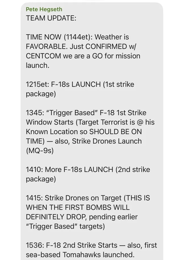 一張Signal聊天截圖,顯示了襲擊計劃的具體內容。攝影師:大西洋月刊戈德伯格在最初週一的文章中保留了一些細節。但今天的報道顯示,關於時間、目標和所涉武器的細節來自國防部長皮特·赫格塞斯的短信。