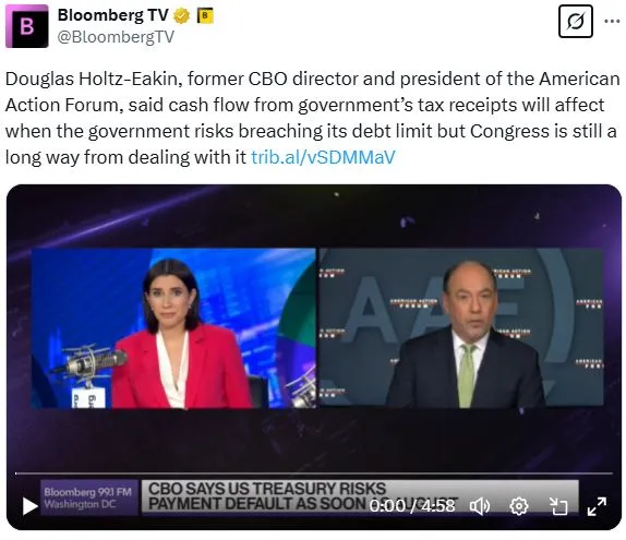 今天下午1點彭博電視台權力平衡早間節目中,主持人喬·馬修和凱莉·萊茵茨採訪了前國會預算辦公室主任、美國行動論壇主席道格拉斯·霍爾茨-埃金,討論國會在美國面臨違約風險前提高國家債務上限的問題。