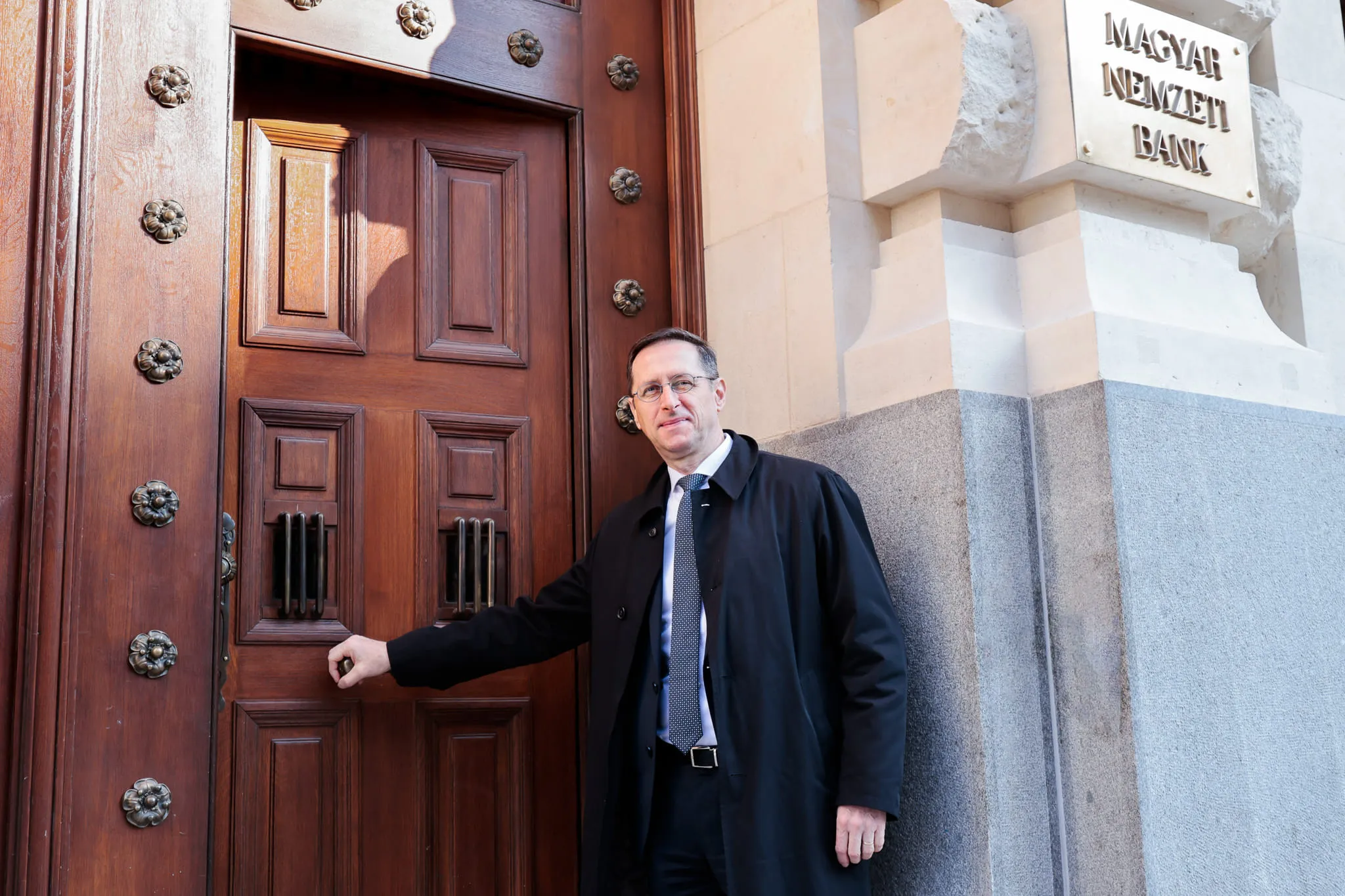 3月4日發佈的照片中,米哈伊·瓦爾加進入匈牙利央行。圖片來源:匈牙利央行監管文件顯示,在馬托爾西任期最後幾天,基金會資產控制權從投資管理公司Optima轉移至一傢俬募基金。