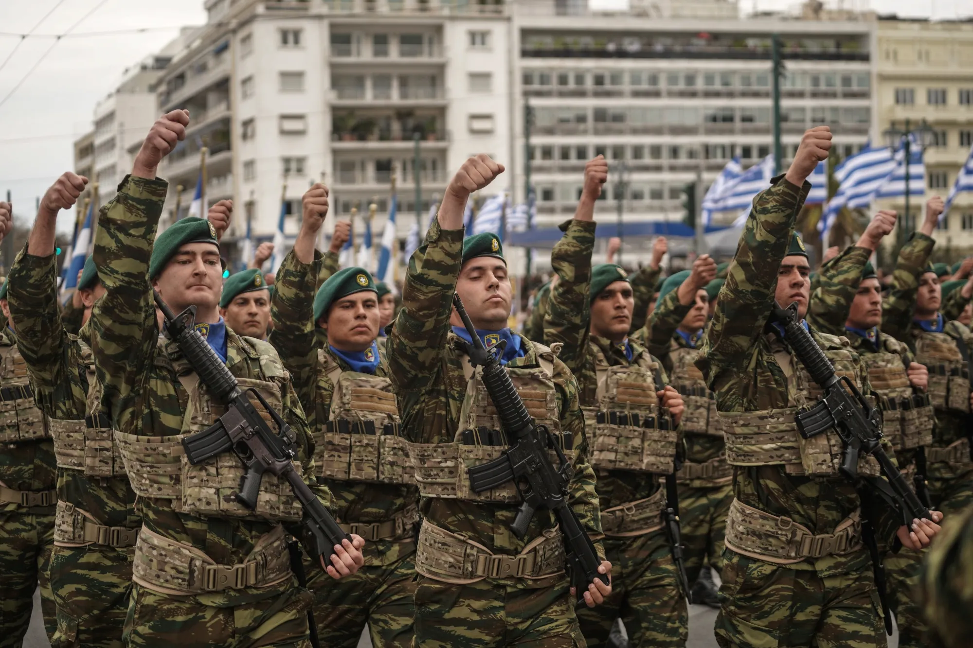 週二希臘士兵參加閲兵式場景。攝影師:尼克·帕萊奧洛戈斯/彭博社### 更多來自彭博社的內容