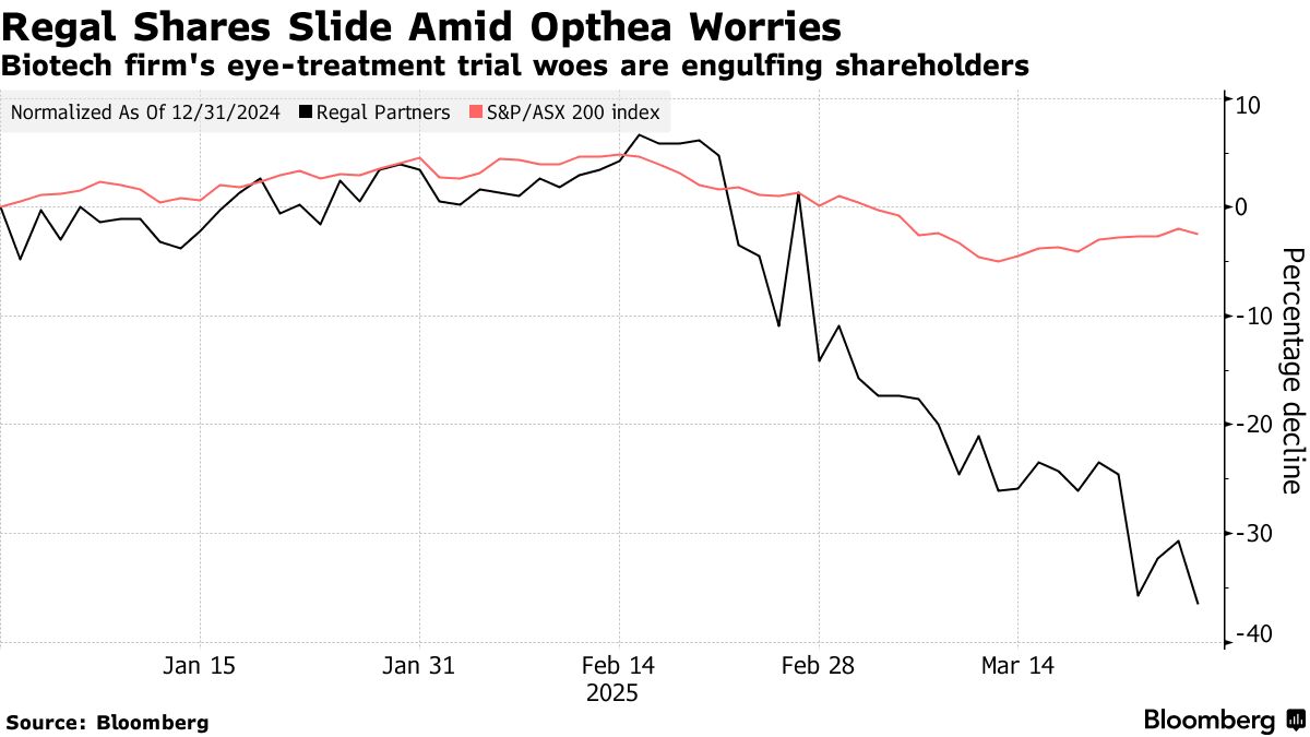 由Phil King執掌的Regal股價週四續跌8.9%,年內累計跌幅達37%。該公司週二告知投資者,已將Opthea估值大幅下調至0.2澳元。Opthea停牌前最後成交價為0.6澳元。