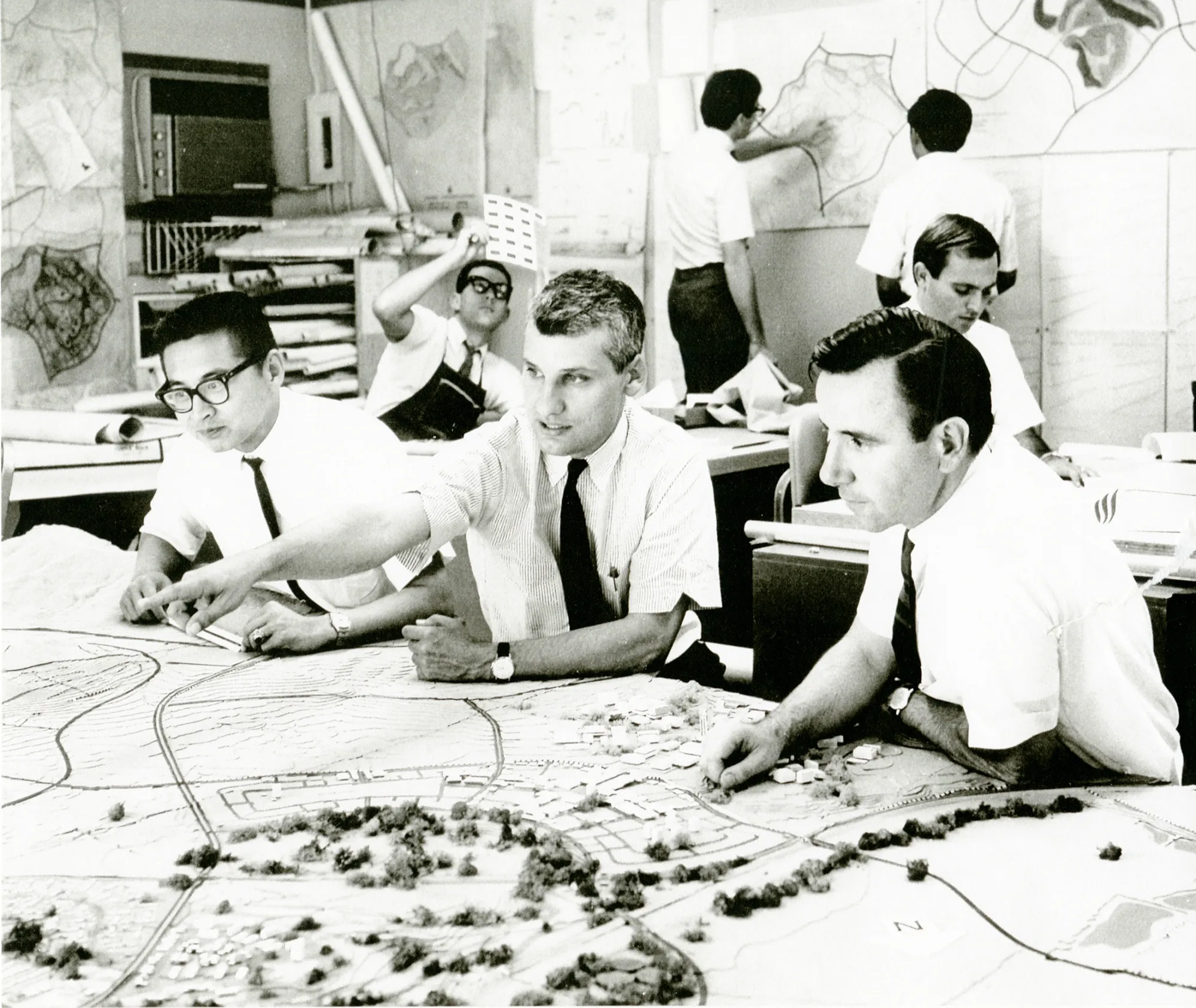 1960年代高管們在爾灣牧場總部查看規劃方案。圖片來源:加州大學爾灣分校特藏檔案館### 更多來自彭博加州