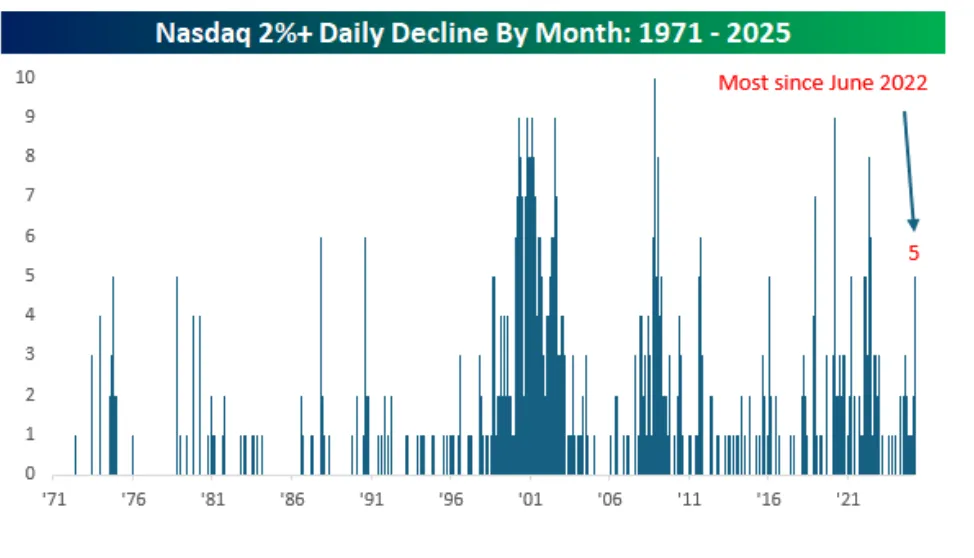 根據Bespoke投資集團的數據,納斯達克綜合指數下跌2.7%,這是3月份第五次跌幅至少達到2%——這是自2022年6月熊市以來單月最多的一次。道瓊斯工業平均指數下跌1.7%。所有大型股均下跌,亞馬遜公司和Alphabet公司跌幅超過4%。Lululemon Athletica公司因前景黯淡暴跌14%。