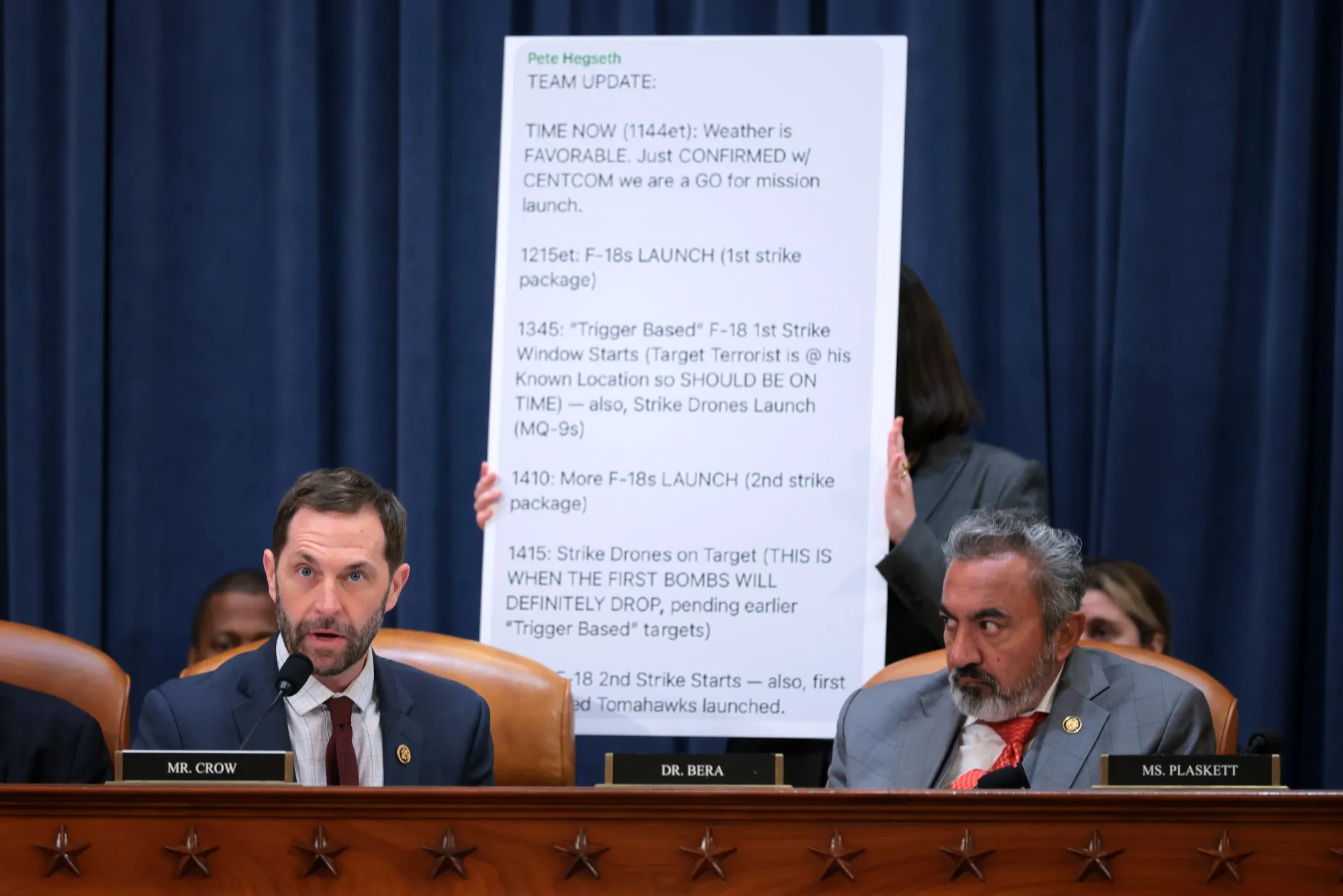 3月26日,傑森·克勞在華盛頓特區朗沃斯眾議院辦公大樓聽證會上展示皮特·赫格塞斯的短信內容。攝影師:凱拉·巴託科夫斯基/蓋蒂圖片社### 特朗普政府面臨何種反彈?