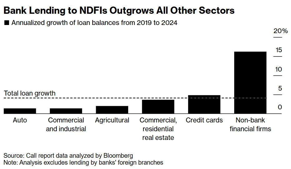 據他們援引彭博社分析的數據報道,銀行對對沖基金、私募股權公司和私人信貸機構等非存款類金融機構(NDFI)的貸款在過去五年中增長了一倍多。