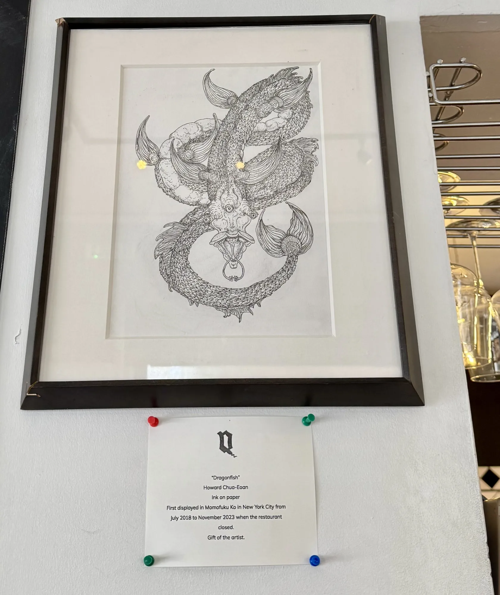 趁員工未散、歇業常有的混亂尚未將物品四散前,我設法取回了畫作。它在我的上西區公寓角落沉寂數月——直到倫敦某餐廳經理向我求畫。作為法靈頓Quality Wines的常客,我如同當年在Ko般自在,時常取出寫生簿作畫。於是我説:“正好有幅現成的。“今年1月在紐約,我將《龍魚》裝入行李箱(免關税!)帶回了倫敦。