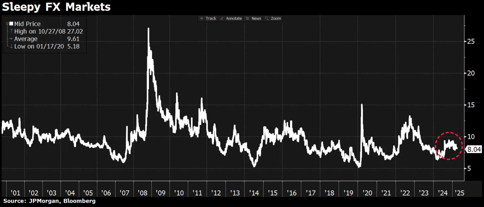 …這讓我們來到了(我最不喜歡的)市場:外匯。正如之前在這個欄目中提到的,面對所有這些頭條新聞和潛在的全球重大變化,貨幣波動性仍然相當低。你可以在下面的圖表中看到這一點,該圖表顯示了摩根大通的全球外匯波動率指數。即使債券市場波動不斷,貨幣市場仍然相對平靜。這也很奇怪。