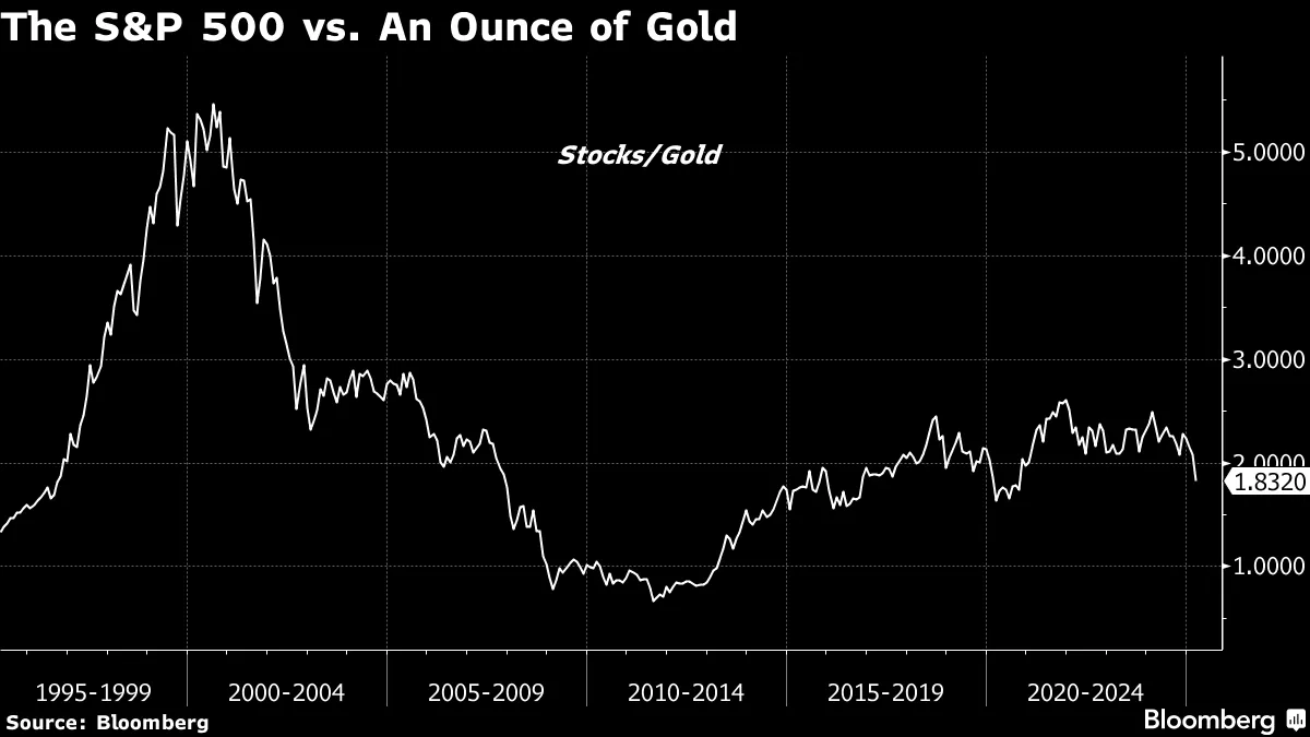 因此,我時不時會查看標普500指數與一盎司黃金的走勢對比圖。多年來我一直在寫這個話題。股票代表着人類的智慧與進取精神,是共同創造新價值產物的體現。而黃金呢?就相形見絀了。