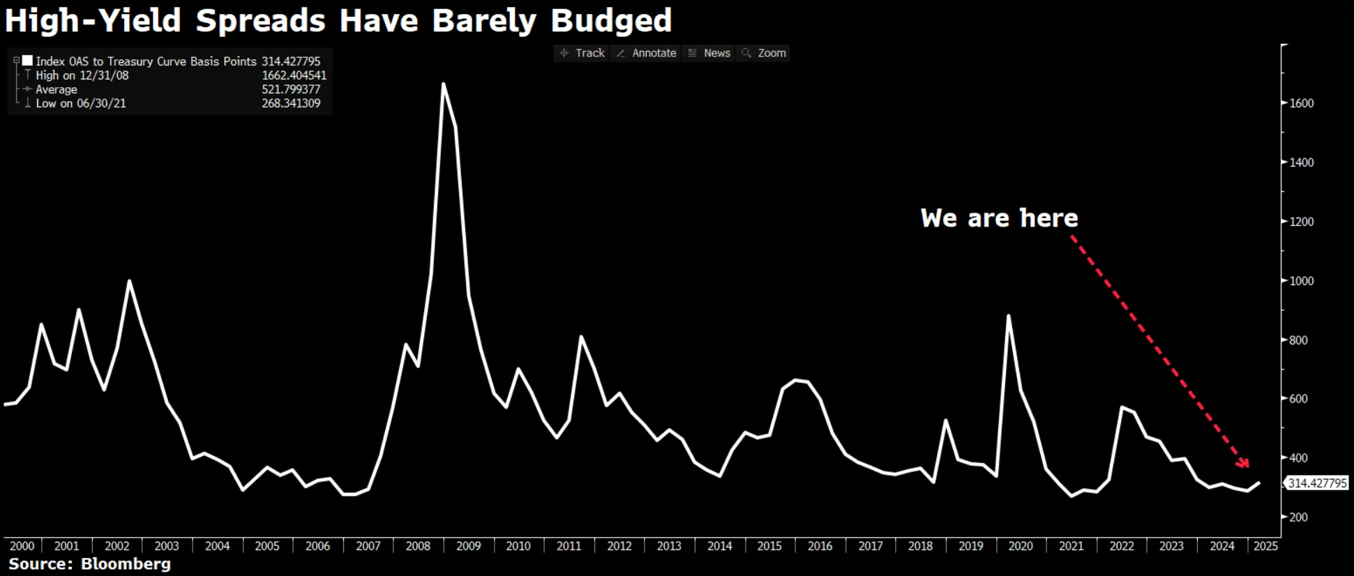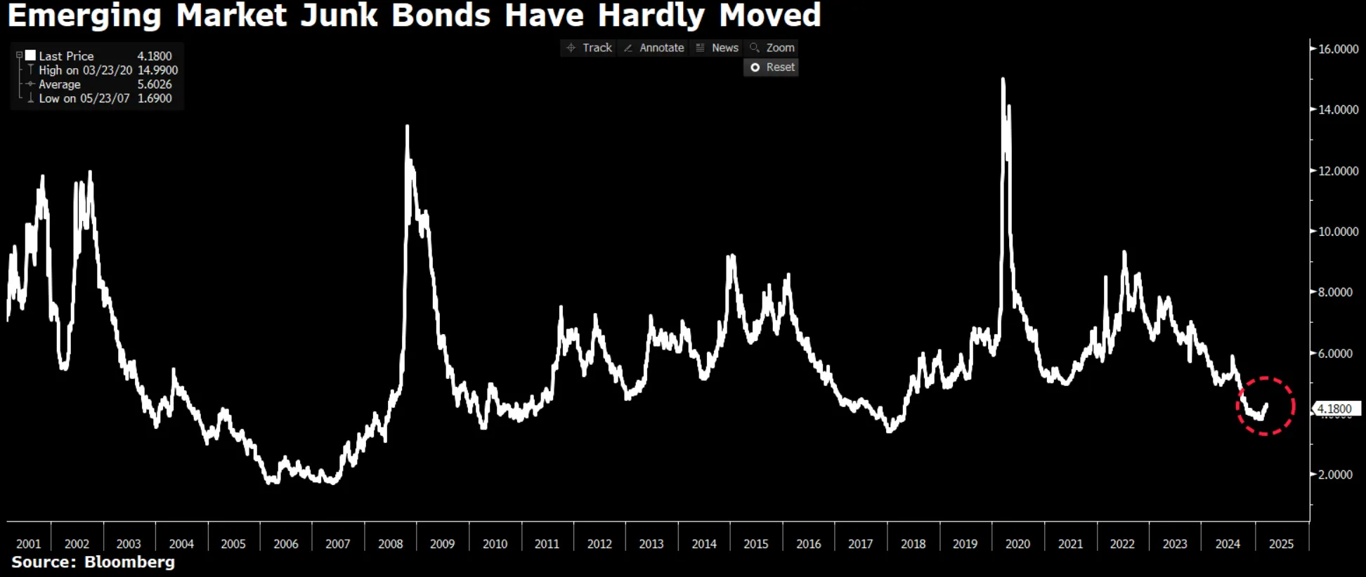 順便説一句,新興市場的垃圾債券也是如此。這裏的平均利差約為3.5%,而長期平均值為7%。通常情況下,你會預期關税前景和仍然相當高的美元匯率會給新興市場經濟體和企業帶來壓力…