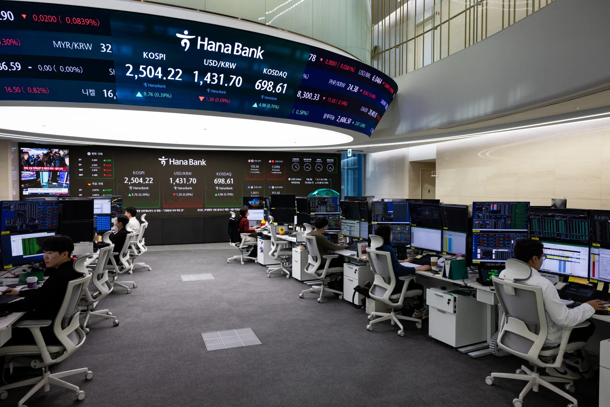 2024年12月16日,韓國首爾韓亞銀行交易室內,屏幕顯示韓國綜合股價指數及韓元對美元匯率。攝影師:趙成俊/彭博社隨着全球對沖基金和銀行採用的賣空交易策略於3月31日解禁,韓國1.7萬億美元規模的股市重新開放賣空交易。