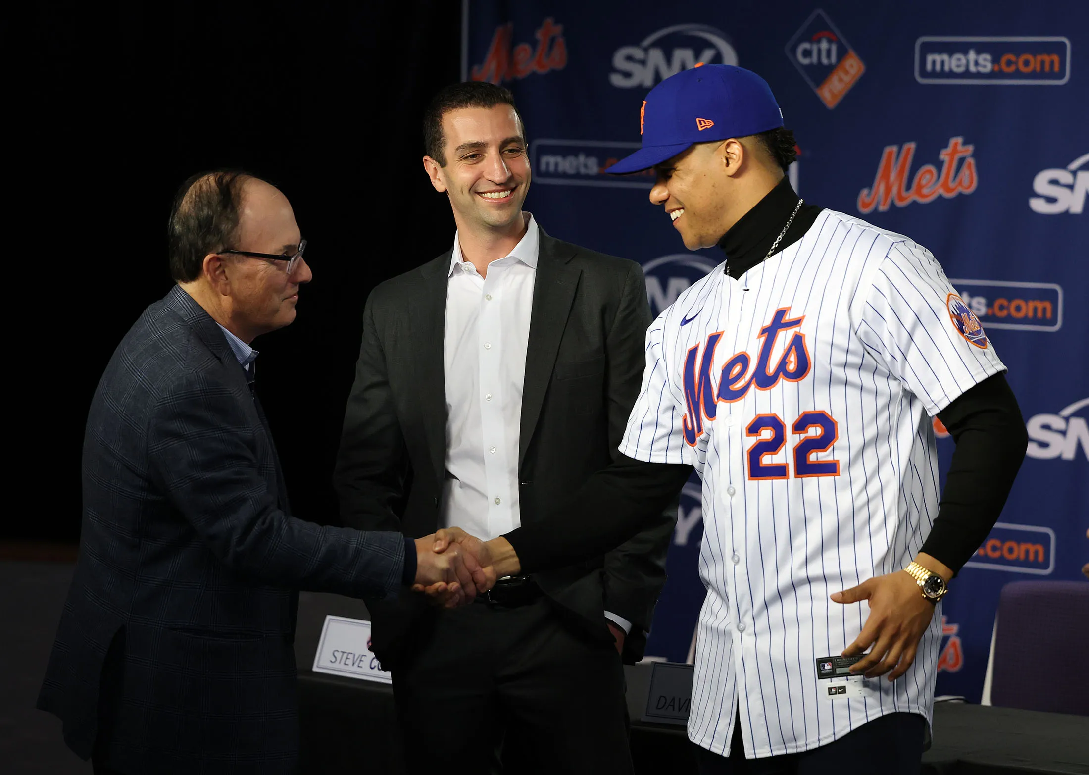 科恩(左)在索托的加盟發佈會上與其握手,大都會棒球運營總裁大衞·斯特恩斯在一旁註視。攝影師:阿爾·貝洛/蓋蒂圖片社與此同時,衞冕世界大賽冠軍洛杉磯道奇隊繼續招兵買馬,將兩屆賽揚獎得主布萊克·斯內爾等強援納入麾下,其賽季薪資總額高達3.91億美元領跑全聯盟。大都會隊以3.25億美元總薪資位列第二。這兩支球隊已形成"燒錢雙雄"格局,連未能留住索托的紐約洋基隊都抱怨難以追趕。洋基老闆哈爾·斯坦布倫納在球隊世界大賽敗北數月後,於今年一月談及道奇隊時表示:“對我們大多數老闆來説,效仿他們的做法實在力有不逮。”