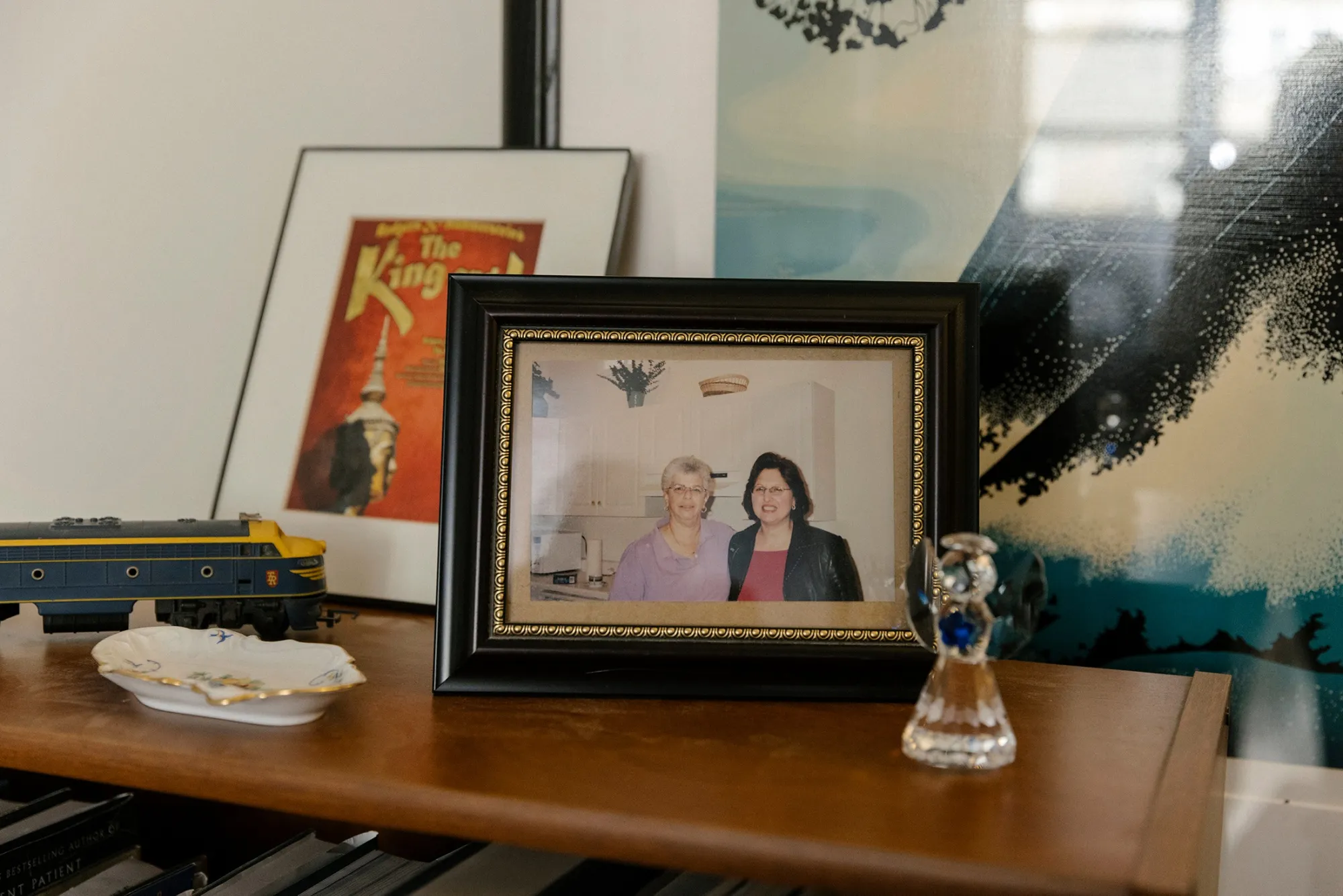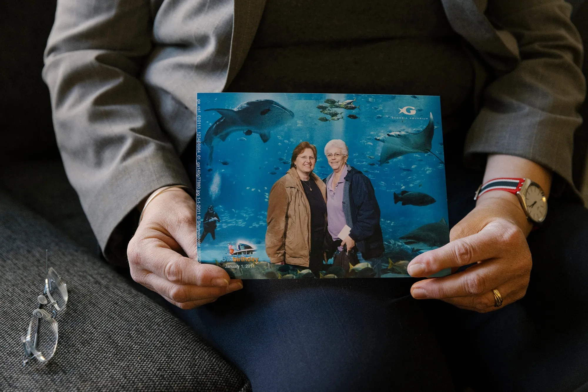 瓦萊麗·波特手持已故伴侶蘇珊·亞倫的照片(右),亞倫在服用阿爾茨海默病藥物Leqembi後出現相關症狀離世。