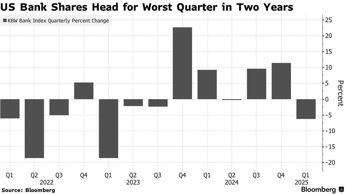 美國銀行股正邁向自兩年前地區性銀行倒閉引發危機恐慌以來的最差季度表現,這主要受到唐納德·特朗普總統貿易戰所引發的廣泛經濟憂慮的衝擊。