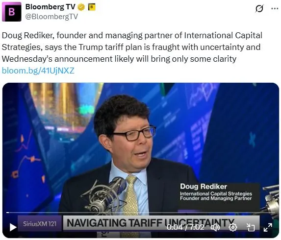 今天下午1點,彭博電視台《權力平衡》早間版節目中,主持人喬·馬修和凱莉·萊因茨採訪了國際資本策略創始人兼管理合夥人道格·雷迪克,討論了特朗普即將宣佈的關税政策及美國貿易伙伴的潛在反應。