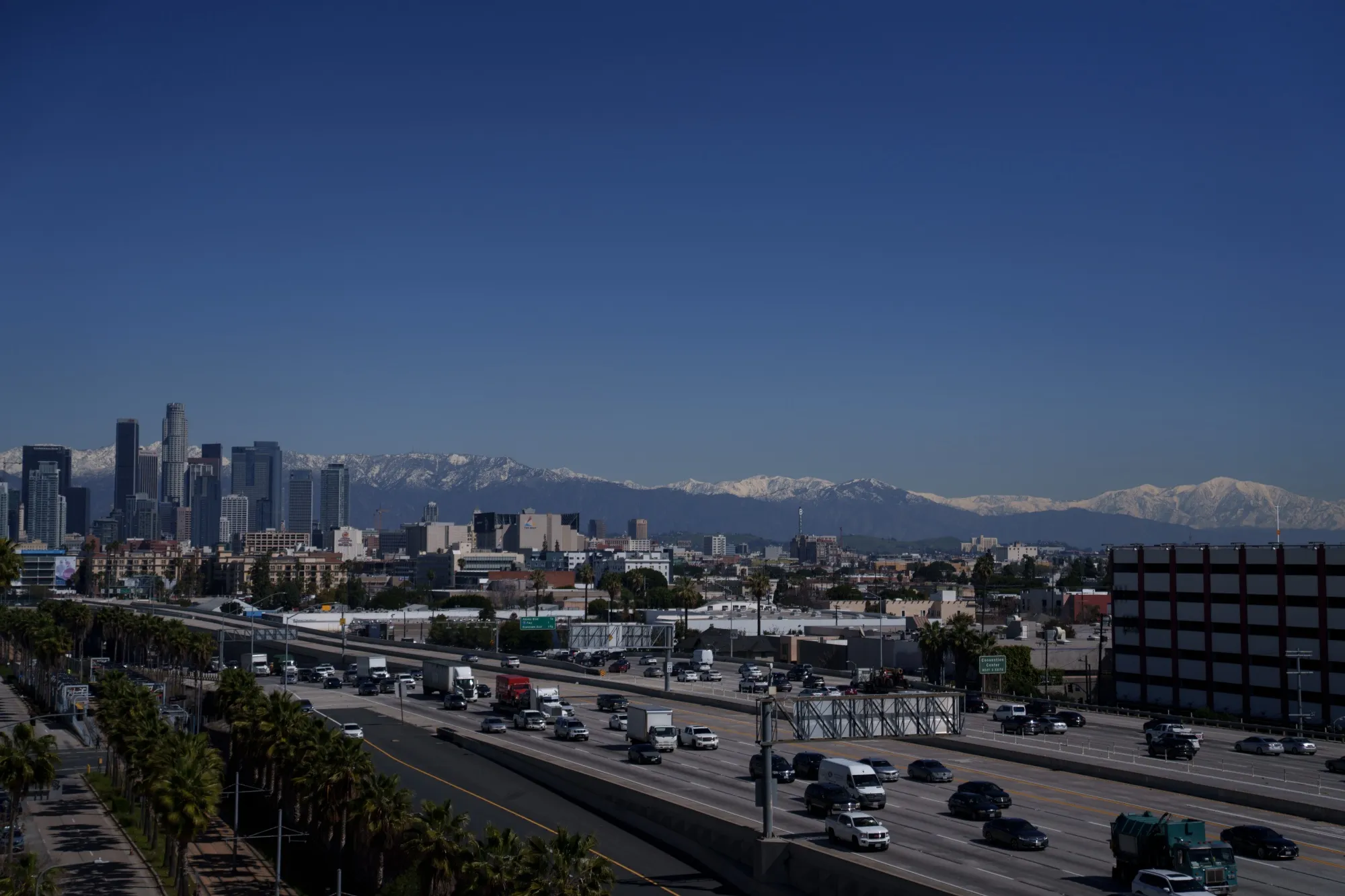 2023年3月洛杉磯冬季風暴過後,白雪皚皚的聖蓋博山脈映襯着洛杉磯市中心的天際線。