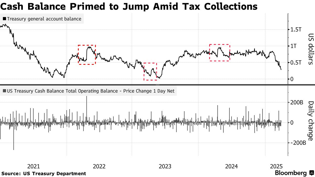 萊特森ICAP的低置信度預測顯示,4月和5月期間非代扣所得税收入將較上年同期增長11%,低於美國國税局未向洛杉磯野火等自然災害影響地區延長報税期限情況下本可達到的16%增幅。由Teresa Ho領銜的摩根大通策略師估計,貨幣市場基金可能損失1450億至1650億美元,而銀行準備金可能減少2000億至4500億美元,因為人們會提取現金繳納税款。