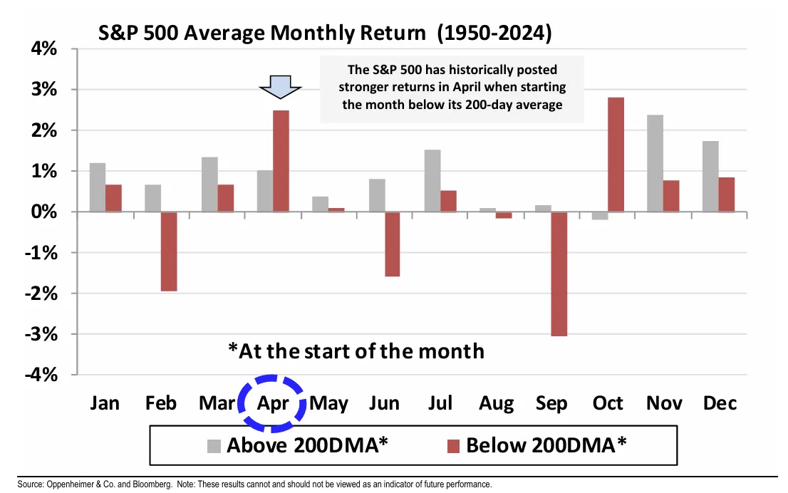奧本海默高級分析師阿里·沃爾德指出,從歷史數據看,當標普500指數低於200日均線時,四月往往是全年表現最佳的月份之一——自1950年代以來平均漲幅超過2%。
