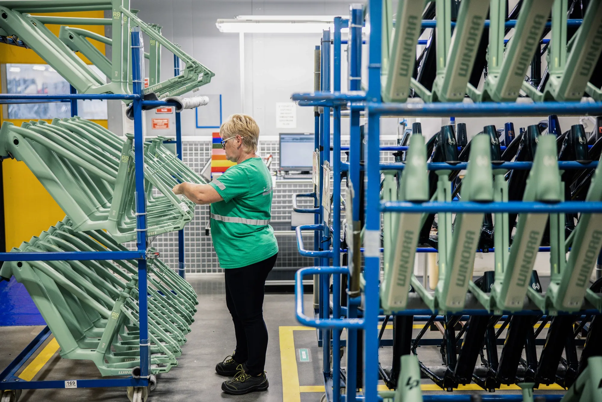 2022年,匈牙利托斯澤Accell Hunland Kft工廠的電動自行車裝配線上,一名員工正在檢查已噴塗的Winora自行車車架。