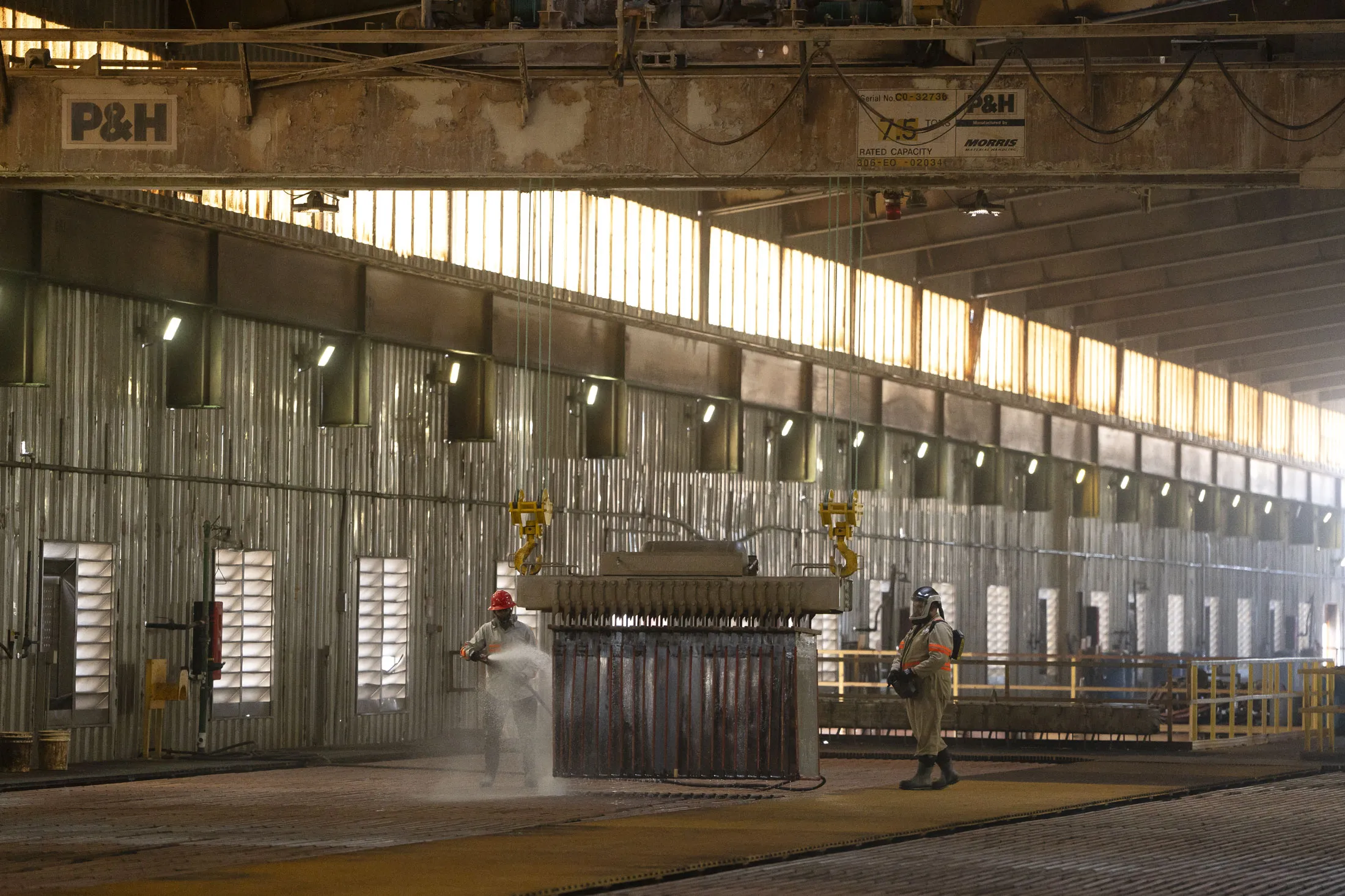 莫倫西加工廠工人沖洗99%純度的銅板。攝影師:麗貝卡·諾布爾/彭博社然而硫化浸出法的成功並非必然。相關企業難以證明其技術可大規模應用,且鮮有公司願冒險率先對這種新工藝進行重大投資。私下裏,部分礦商在與合作伙伴就所有權條款討價還價時,對這些技術的可行性提出了質疑。