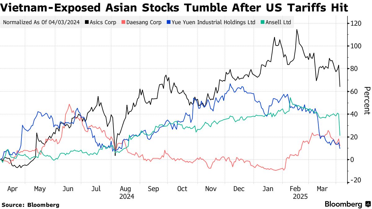 日本運動鞋製造商亞瑟士、韓國包裝食品公司大翔集團等企業在越南設有生產線,在特朗普對越南實施46%的關税(美國最高的“對等”税率之一)後,這些公司的股價暴跌。亞瑟士股價一度下跌11%,而去年在越南增加產能的大翔集團股價下跌超過7%。增加耐克公司和阿迪達斯公司的亞洲供應商股價也大幅下跌。