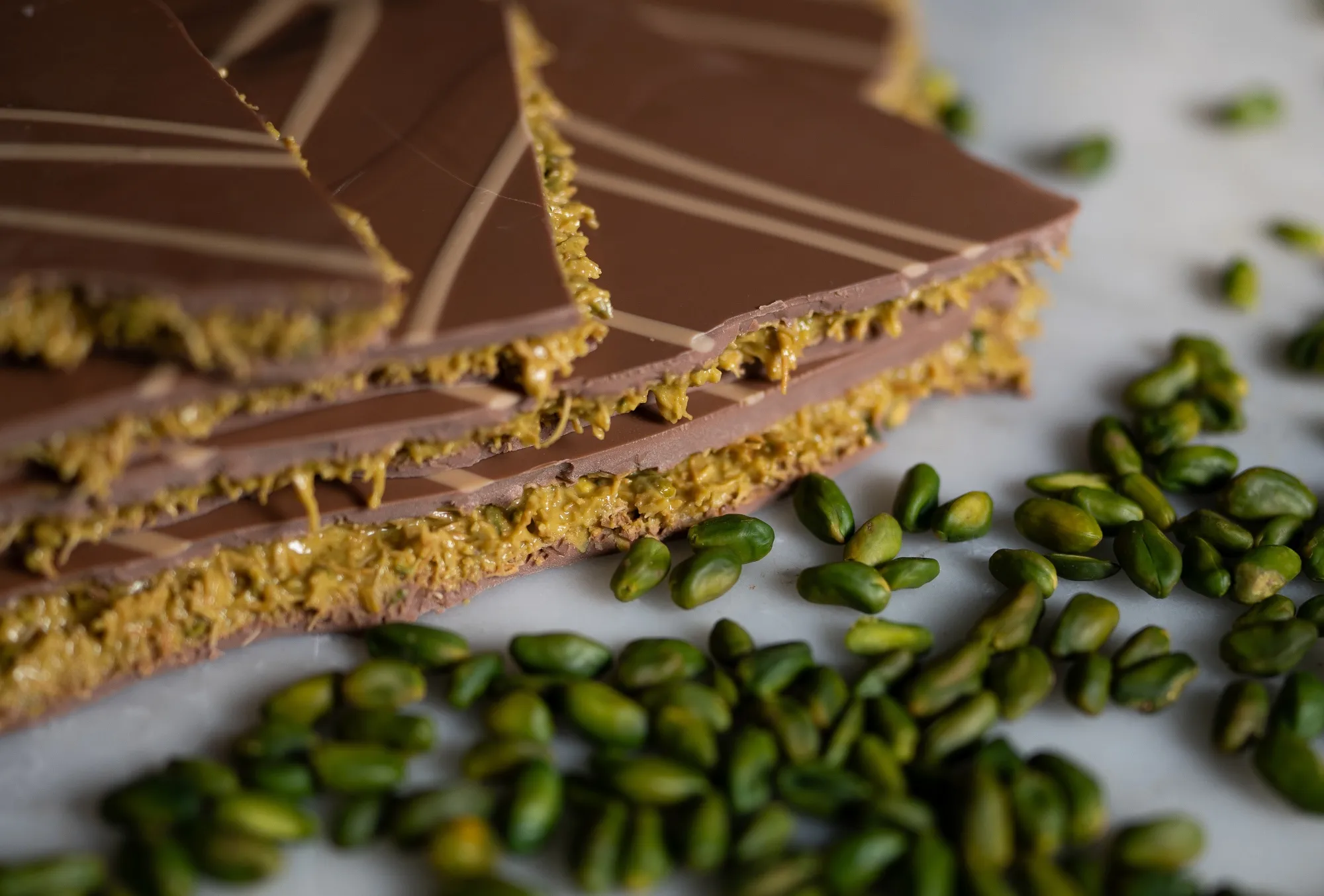 迪拜巧克力自2021年問世,當時一位名叫莎拉·哈穆達的女性為她創立的Fix Dessert Chocolate公司研發了這款產品——將甜鹹口味的開心果醬與芝麻醬、酥脆的費羅酥皮分層包裹巧克力。這種甜點迅速在TikTok上走紅,人們開始自制,關於這種堅果香脆巧克力的帖子經常獲得數百萬瀏覽量。需求如此強勁,甚至影響了土耳其開心果產業:2024年該國大幅增加敍利亞堅果出口以穩定果仁蜜餅等糕點價格。美國市場需求之狂熱導致山寨版氾濫。如今迪拜巧克力終於也在英國爆紅。