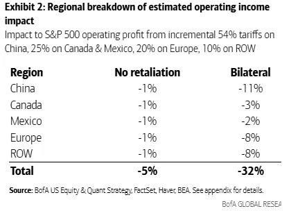 “沒有關税劇本,”報告稱。“如果貿易伙伴以同等的報復性力量回應,相互關税可能會使當前標普500的營業收入減少32%。”