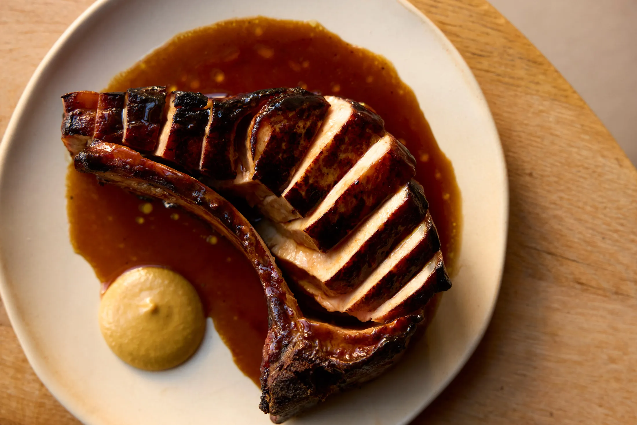 多佛餐廳供分享的30天熟成塔姆沃思豬雙裏脊排。攝影師:薩菲婭·沙卡爾奇/多佛倫敦當下最熱門的餐飲街區是哪裏?答案是諾丁山。而在這個高能量區域中,頂級餐桌當屬主廚傑克遜·博克瑟重新執掌的老店奧賽餐廳。在這個米色與鋼藍色交織的温馨空間裏,博克瑟將舒適美食發揮到極致——這正是當下最火爆的餐飲趨勢之一。