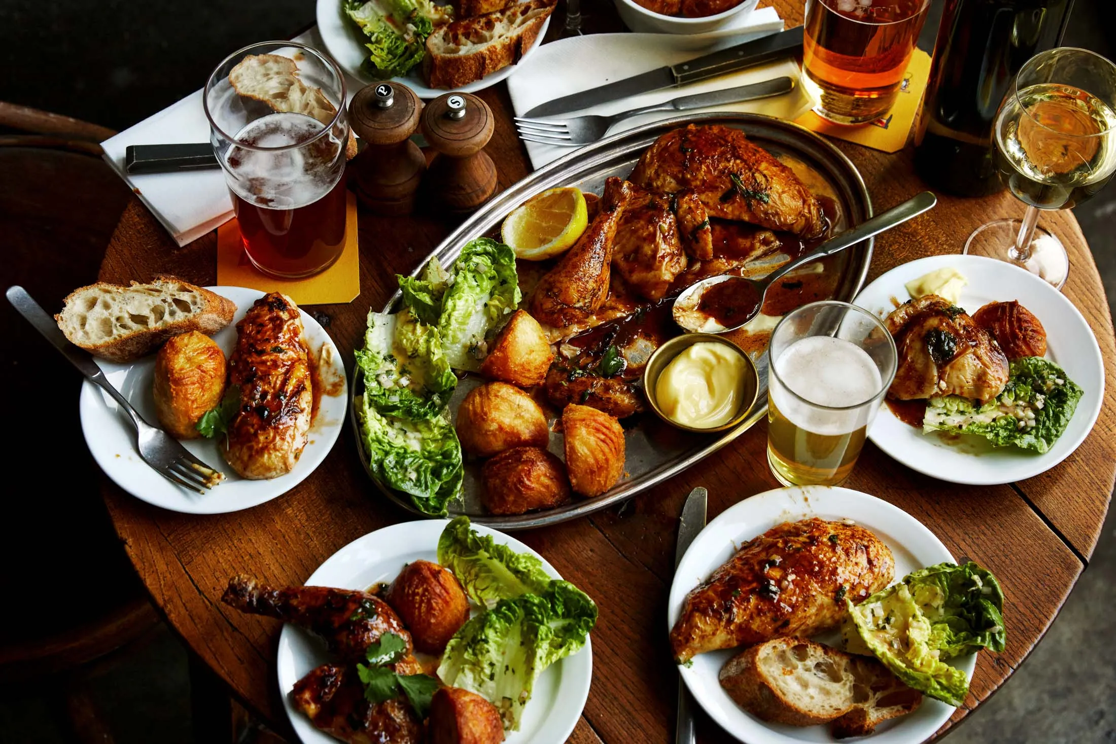 名廚帕特里克·鮑威爾——曾任職於米德蘭大酒店餐廳——為酒吧小食帶來專業演繹,包括瑞士芝士燻牛肉三明治和包裹着蝦慕斯的絕妙蘇格蘭脆皮蛋(每份12英鎊)。招牌菜旋轉烤雞經過鹽水醃製,烤製得金黃誘人,搭配雞油烤土豆、小份沙拉和法棍切片吸飽肉汁。這份可供兩三人享用的烤雞僅售38英鎊,相當於倫敦其他餐廳幾片禽肉的價格。生啤來自獨立釀酒廠,比如特倫特河畔伯頓備受推崇的奧索普酒廠經典雙鑽淡啤。