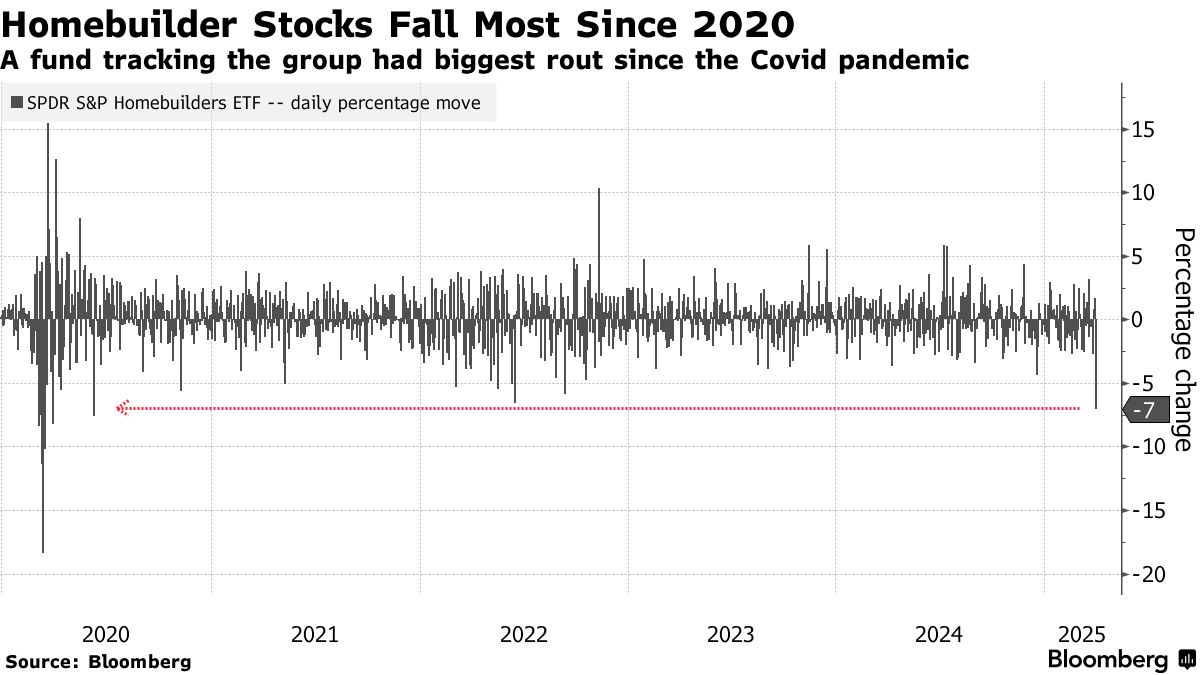 房地產建築商夾在高利率、經濟衰退擔憂和關税導致成本上升的三重打擊中,單日跌幅達7.1%,收盤價較200日均線低17%,創2020年6月以來最大單日暴跌。