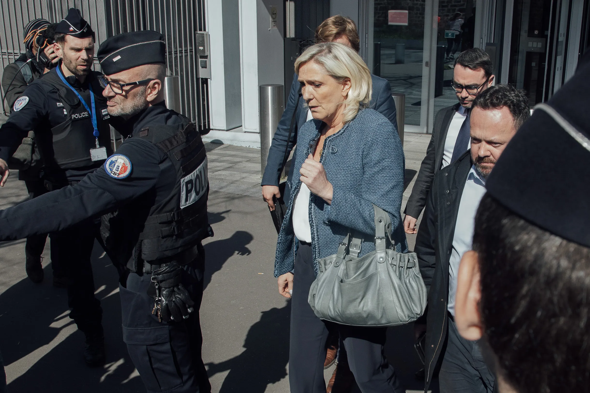 2025年3月31日週一,國民聯盟領導人瑪麗娜·勒龐離開巴黎一家法院。
