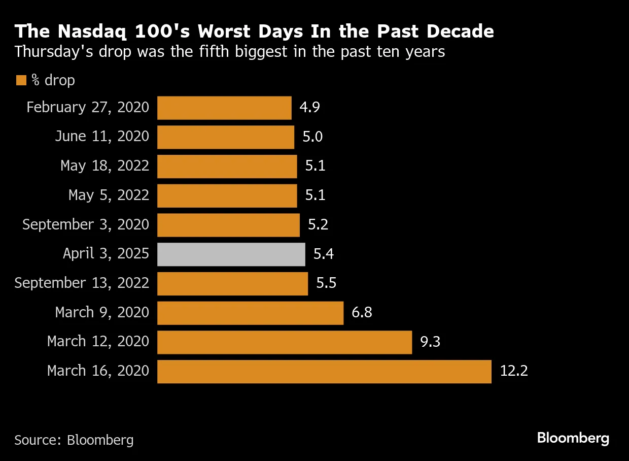 投資者迅速作出反應,在特朗普宣佈其計劃後,蘋果股價週四下跌9.3%。這是自2020年3月以來iPhone製造商遭遇的最大跌幅,公司市值蒸發超過3100億美元。彭博追蹤的所謂"七巨頭"股票指數下跌6.7%。