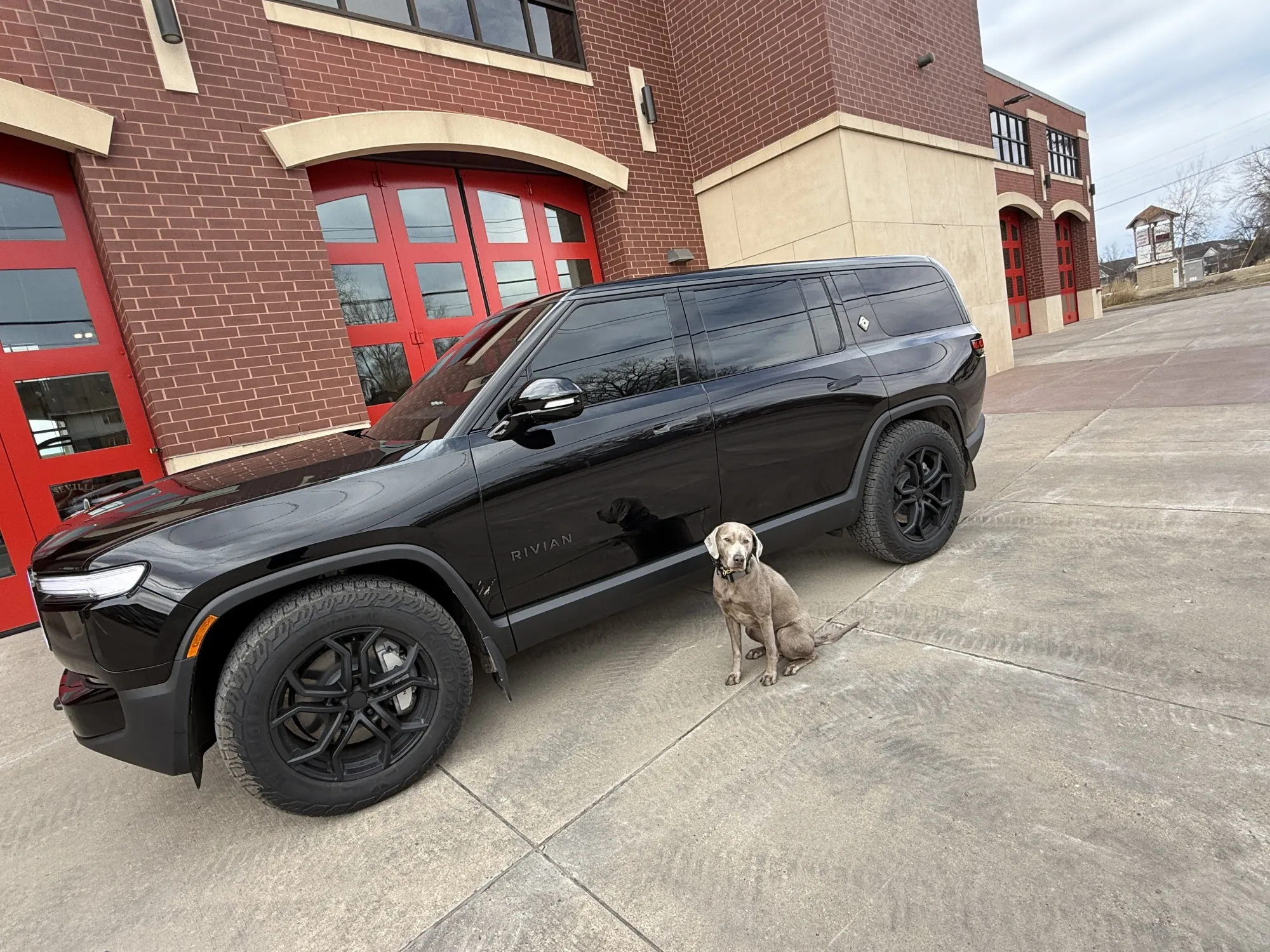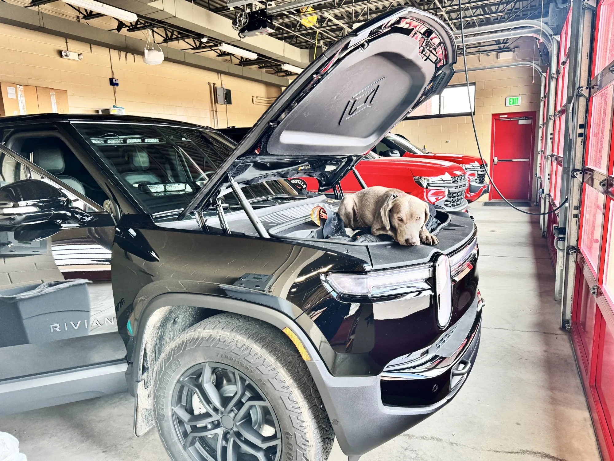 明尼蘇達州羅斯維爾消防局的治療犬"灰燼"正享受着隊伍新購置的Rivian電動SUV的"寵物舒適"功能。