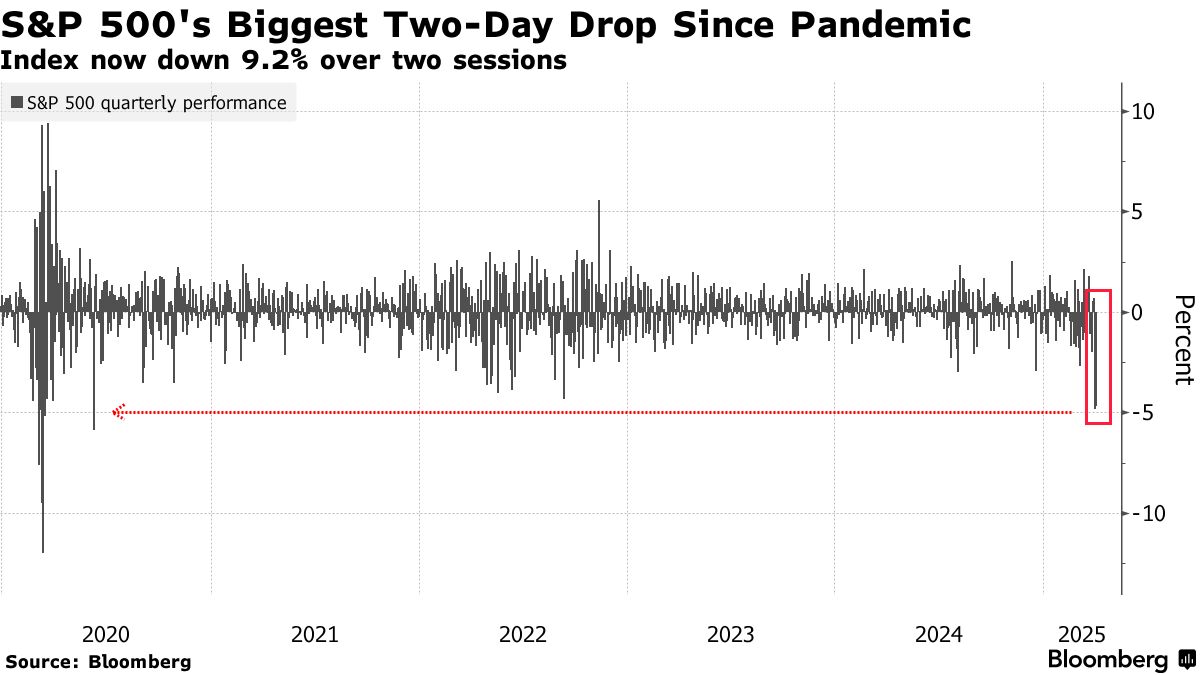 標普500指數一度下跌5.2%,正邁向自2020年3月疫情導致美國封鎖以來最大的兩日累計跌幅。