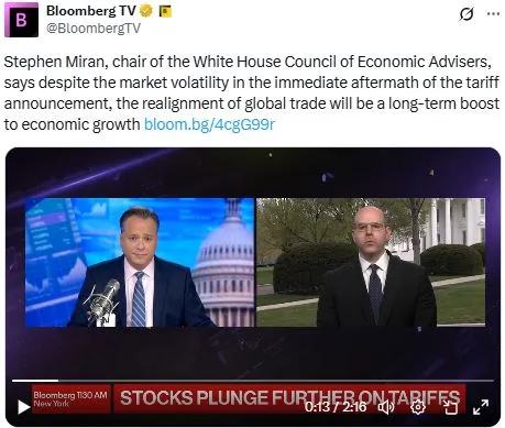 今天下午1點,彭博電視台《權力平衡》早間版節目中,主持人喬·馬修和凱莉·萊茵茨採訪了白宮經濟顧問委員會主席斯蒂芬·米蘭,討論了今天的就業報告、關税和美元問題。
