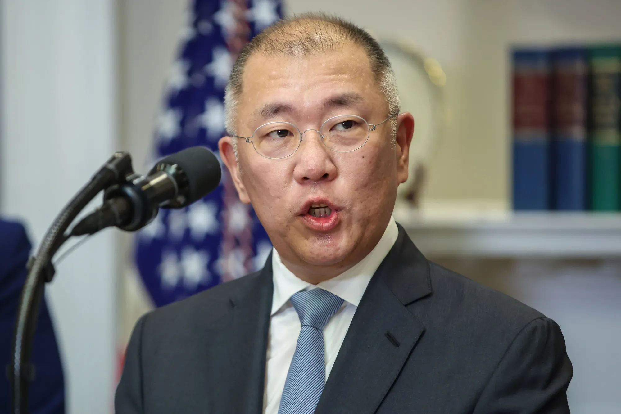 現代汽車集團會長鄭義宣在白宮宣佈路易斯安那州新鋼廠計劃。攝影師:塞繆爾·科魯姆/Sipa/彭博社白宮發言人庫什·德賽指出,蘋果和現代等企業的投資"體現了本屆政府在實施特朗普總統親增長、親工人的’美國優先’議程——包括關税、放松管制、減税和釋放美國能源潛力——時與私營部門的協作”。