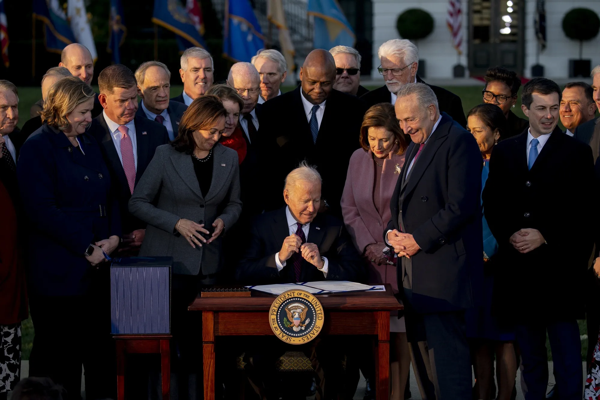 喬·拜登於2021年簽署《基礎設施投資與就業法案》。攝影師:Stefani Reynolds/彭博社就拜登而言,選民們未能及時看到政策效果,因此未能在2024年將華盛頓的控制權交給民主黨。根據憲法規定,特朗普不能第三次連任。但如果選民對他的政策感到不滿,可能會在2026年中期選舉或2028年總統大選中給他的政黨帶來麻煩。
